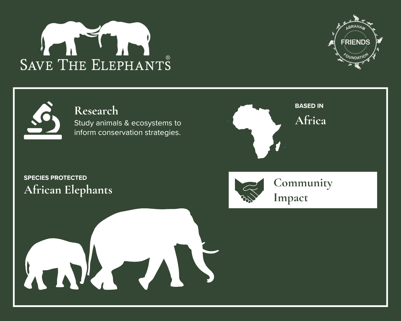 Founded in 1993 by Dr. Iain Douglas-Hamilton, Save the Elephants is a research and conservation organization based in Nairobi, Kenya. Focusing on the African Elephant, Save the Elephants conducts ground-breaking research on elephant biology, elephant intelligence, human-elephant conflict and coexistence, and elephant behavior- mainly tracking continental movements and communication. Their education and outreach programs work on empowering local Kenyan communities as true custodians of the land. Save the Elephants's mission is to secure a future for elephants in an ever-changing climate.